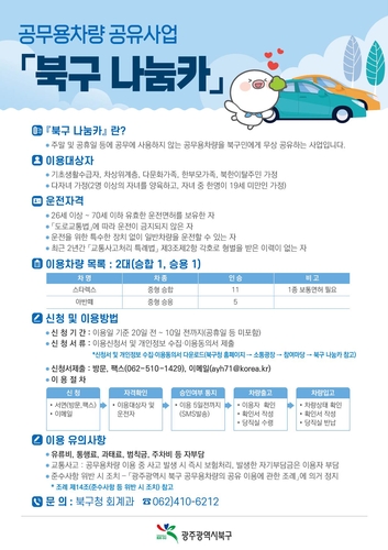 광주시 북구(구청장 문인)는 주말 및 공휴일에 운행하지 않는 공무용차량을 지역 주민들에게 무상으로 공유하는 '북구 나눔카' 사업을 시행한다고 밝혔다.이번 사업은 공무용차량을 주민들과 공유해 생활 속 이동 수단이나 여가 활동에 이용할 수 있게 함으로써 주민의 생활편의와 삶의 질을 높이고 유휴자원 활용을 통한 공유경제 활성화